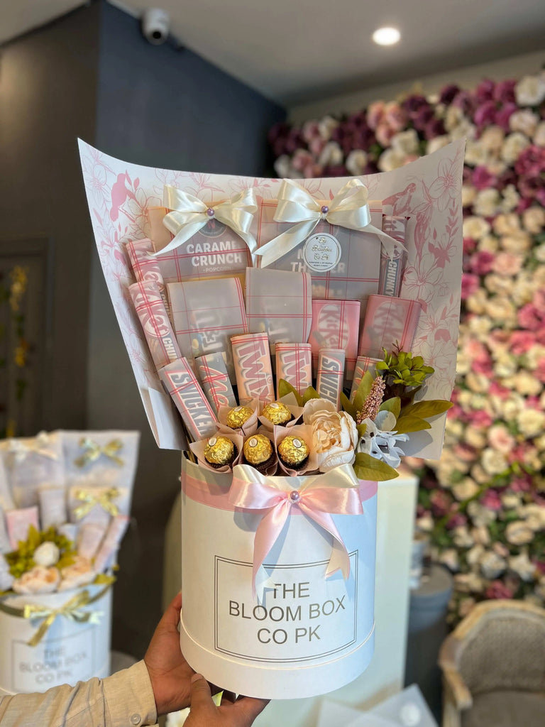 A mix of imported chocolates artificial flowers in a Bloombox with imported Pink wrapping